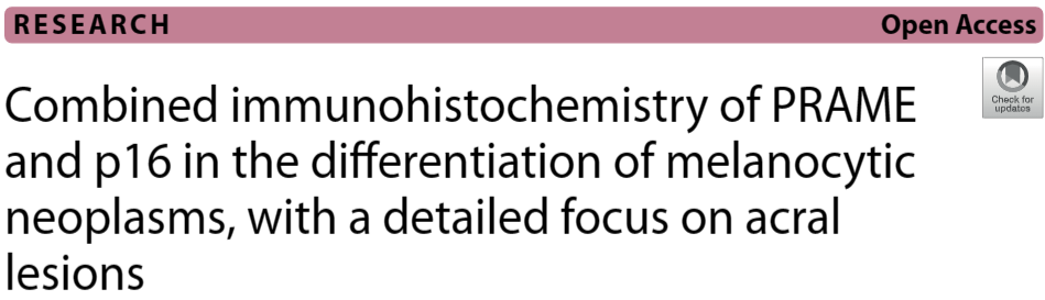 【文獻(xiàn)題目】Combined immunohistochemistry of PRAME and p16 in the differentiation of melanocytic neoplasms, with a detailed focus on acral lesions.