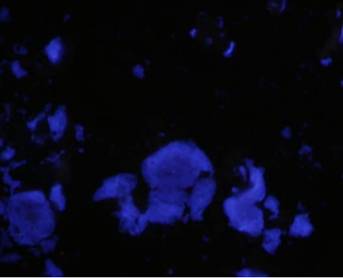 - 灶片狀著色 A. 裱片時水未排盡,或組織的局部形成氣泡使組織突起,染色時試劑滲入后不易洗盡,顯色過深。解決辦法是,漂片盒里的氣泡應(yīng)去盡,漂片時一旦產(chǎn)生了氣泡可將鑷子伸到水里從組織下面輕輕將氣泡移走。撈片后要傾斜放置幾分鐘利于水流走,然后在放到烤片儀上進(jìn)行烤片。B. 壞死組織灶,組織壞死后細(xì)胞破壞、酶的釋放、蛋白游離、分解,復(fù)雜的肽鏈殘段(如Fc段)可能與一抗或/和二抗結(jié)合導(dǎo)致最終著色。解決辦法是在選擇染色切片時應(yīng)避免選擇壞死組織較多的組織。C. 制作膠片時,膠的濃度太高,膠在載玻片上不均勻,顯色時膠厚的地方容易非特異灶片狀著色。解決辦法是按照標(biāo)準(zhǔn)的制備方法進(jìn)行。