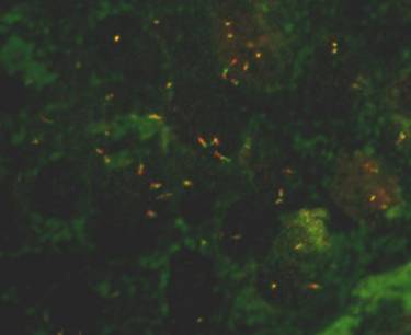 可能的原因 推薦的解決方案 未添加探針(別笑,特別是探針和雜交緩沖液分開的非預(yù)混情況) 探針充分解凍,確保移液器吸取到探針試劑。 探針、雜交緩沖液使用前沒有充分混勻(非預(yù)混探針) 吹打探針混合液,使探針充分混勻,短暫離心。 探針添加數(shù)量不足 確保移液器吸取準(zhǔn)確,探針加入量足量,請不要稀釋探針(包括預(yù)混和非預(yù)混)。 使用前確保探針解凍充分并達(dá)到室溫。 變性前標(biāo)本未制備好 請參照說明書中標(biāo)本制備相關(guān)說明。 標(biāo)本及探針變性不充分 確保玻片進(jìn)行變性時溫度在推薦的溫度。 將玻片變性時間延長2~4分鐘。 變性前標(biāo)本未制備好 請參照說明書中標(biāo)本制備相關(guān)說明。 標(biāo)本及探針變性不充分 確保玻片進(jìn)行變性時溫度在推薦的溫度。 將玻片變性時間延長2~4分鐘。 雜交條件不合適 確保遵守雜交所規(guī)定的時間和溫度。 橡皮膠封片時勿留縫隙。 根據(jù)情況,調(diào)整雜交時間(跨度一般較大)和濕度。 雜交時蓋玻片下有氣泡形成 放蓋玻片時要覆蓋探針表面,輕輕擠壓以便擠出氣泡。 玻片干燥不充分 探針滴加至玻片前,確保玻片上的乙醇溶液已經(jīng)完全揮發(fā)。 探針干燥太快 探針滴加后應(yīng)立即將蓋玻片覆蓋目標(biāo)區(qū)域。 進(jìn)行洗脫時,一次只能移除一張玻片上的蓋玻片,并且在移除下一張之前立即將玻片浸入洗脫液中。 洗脫液或洗脫條件不正確 確保按照產(chǎn)品說明書要求配制洗脫液(生產(chǎn)商提供洗脫液的除外)。 確保洗脫液的溫度達(dá)到洗脫步驟所規(guī)定溫度。 玻片浸入洗脫液前移去蓋玻片。 探針或標(biāo)本玻片儲存不正確 確保探針-20℃避光保存。 將未雜交玻片干燥后置于-20℃長期保存或者室溫短期保存(一般不超過兩星期)。 將雜交后玻片置于-20℃避光保存。 觀察時所選用的濾光片不合適 使用正確濾光片觀察探針熒光情況。詳情咨詢探針供應(yīng)商。 顯微鏡構(gòu)造及物鏡不適宜觀察FISH標(biāo)本,或者濾片組損傷 請聯(lián)系顯微鏡制造商。 汞燈使用時間超過設(shè)計(jì)時間 請更換汞燈。